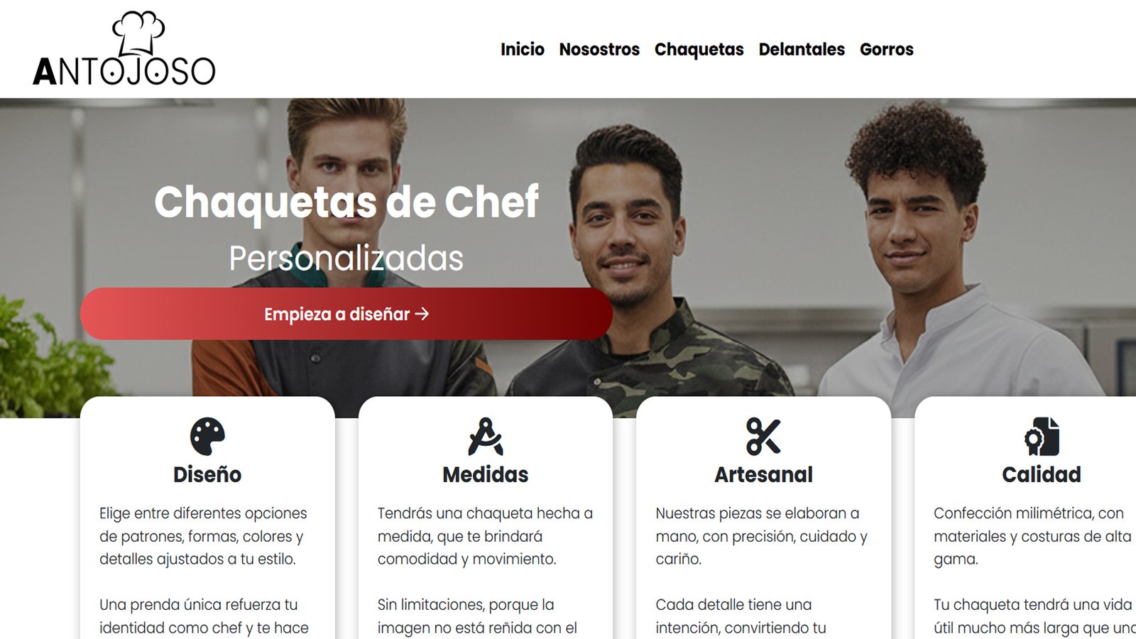 Tienda online simple y enfocada en conversión para una marca artesanal de chaquetas de chef hechas a mano. Diseño limpio, storytelling de marca y estructura orientada a aumentar ventas a usuarios que valoran productos premium hechos a medida.